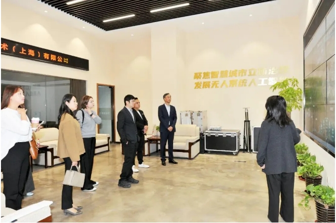 在鉴真防务技术(上海)有限公司,公司相关负责人向参访团一行介绍了公司产品研发、核心业务发展等方面的情况,特别是公司在国内低空防务领域提供集军民两用技术研发、设备生产、系统集成、方案制定和销售服务于一体的无人机安全管控防空整体解决方案上的领先优势。