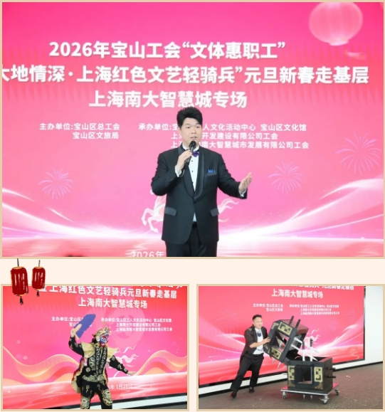 1月28日下午,由区总工会、区文旅局、南大开发公司联合主办的2026年“文体惠职工”暨“大地情深·上海红色文艺轻骑兵”元旦新春走基层活动,在南大数智中心温情开演。活动现场欢声笑语、暖意融融,处处洋溢着喜迎新春的浓厚氛围。